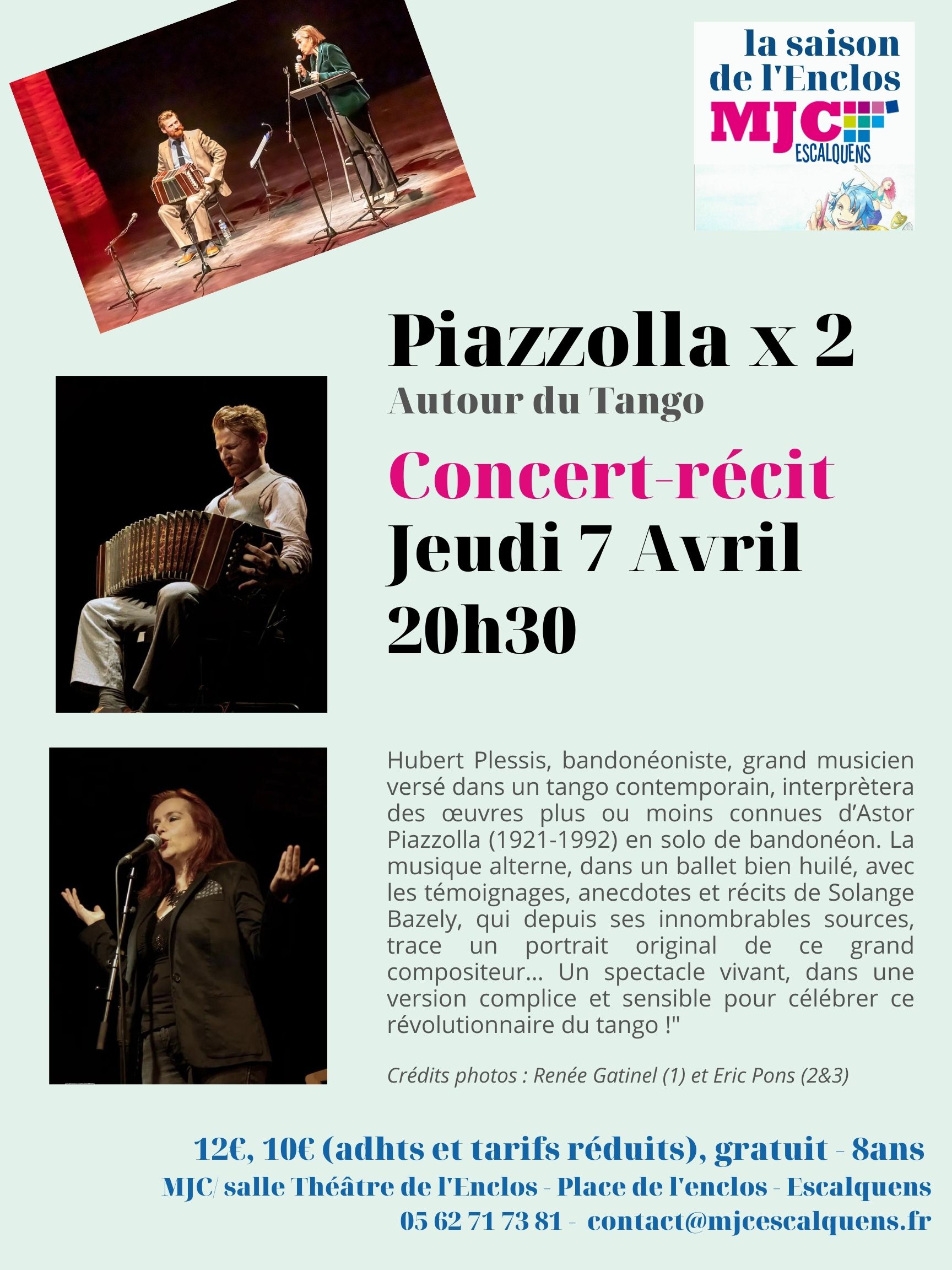 “PIAZZOLLA X 2” a déjà conquis son public : Hubert Plessis, bandonéoniste, grand musicien versé dans un tango contemporain, interprètera des œuvres plus ou moins connues d’Astor Piazzolla (1921-1992) en solo de bandonéon pour profiter au mieux de son instrument de prédilection. La musique alterne, dans un ballet bien huilé, avec les témoignages, anecdotes et récits de Solange Bazely, qui depuis ses innombrables sources, trace un portrait original de ce grand compositeur… Un spectacle vivant, dans une version complice et sensible pour célébrer le 30è anniversaire de la disparition de ce génie du tango !
