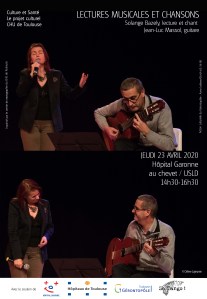 1. Le Gérontopôle du C.H.U. de Toulouse fait appel à nous pour des séances individuelles de lecture au chevet de personnes âgées à l’hôpital Garonne. Cela permet un moment intime et d’échange avec des patients aux capacités cognitives préservées. Séance d’essai le 13 février 2018 et démarrage des lectures et chansons françaises avec le guitariste Jean-Luc Massol de novembre 2020 à janvier 2021 (reportées), dans le cadre du programme « Culture et Santé“, financé par Hôpital Sourire.